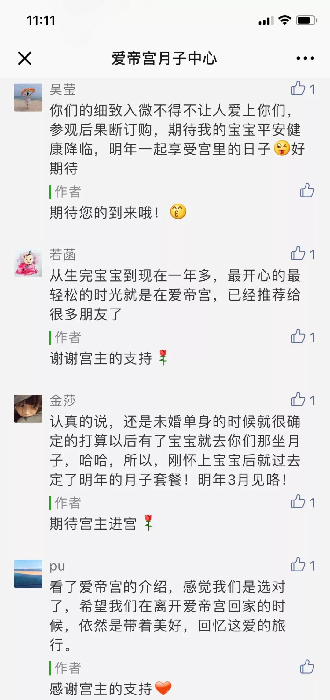 爱帝宫一步一脚印走过的路程,很多曾经的宫主妈妈们都给我们留言,分享她们在宫里坐月子时的真实感受和体验。下面给大家分享一小部分妈妈们的意见和反馈吧!(按时间顺序排列)