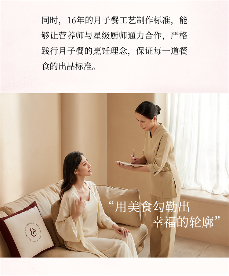 同时,16年的月子餐工艺制作标准,能够让营养师与星级厨师通力合作,严格践行月子餐的烹饪理念,保证每一道餐食的出品标准。