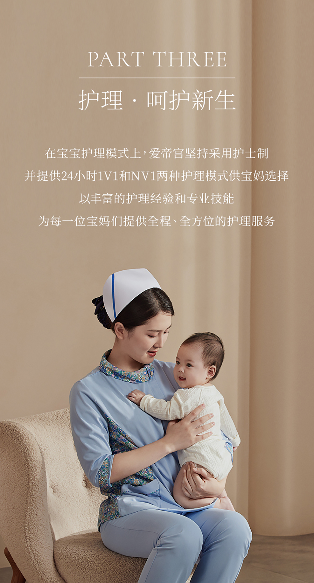 在宝宝护理模式上,爱帝宫坚持采用护士制并提供24小时1V1和NV1两种护理模式供宝妈选择以丰富的护理经验和专业技能为每一位宝妈们提供全程、全方位的护理服务