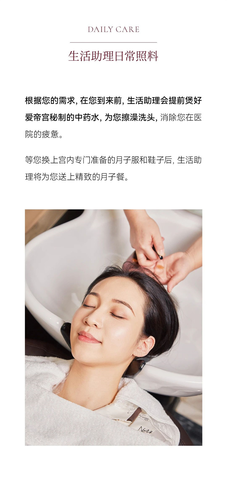 根据您的需求,在您到来前,生活助理会提前煲好爱帝宫秘制的中药水,为您擦澡洗头,消除您在医院的疲惫。