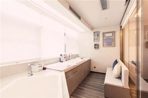 月子房整体的装修风格很温馨,还配有宝宝护理的工作台,在房间就可以看着护士给宝宝洗澡、做抚触和游泳。