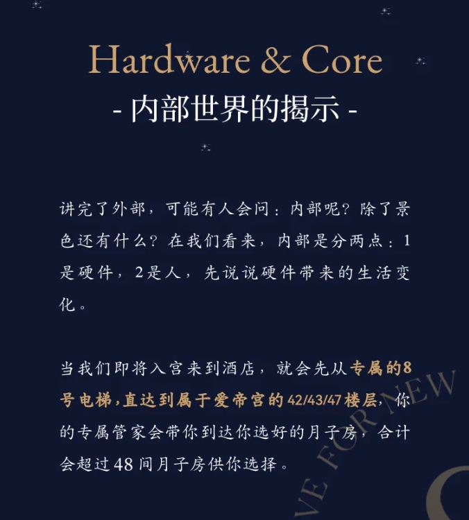 当我们即将入宫来到酒店,就会先从专属的8号电梯,直达到属于爱帝宫的楼层,你的专属管家会带你到达你选好的月子房,合计会超过48间月子房供你选择。